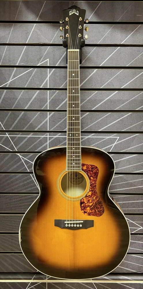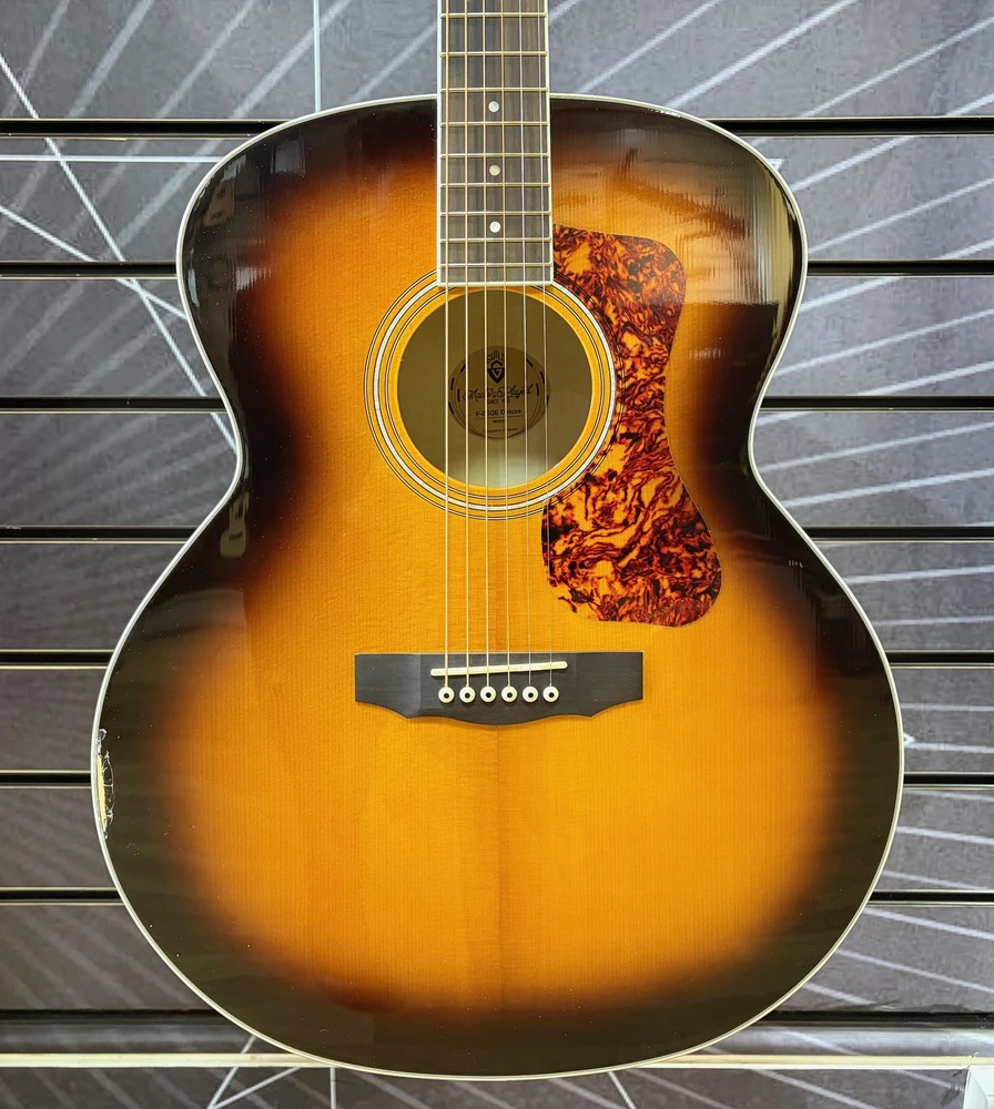 Add a touch of elegance and power to your acoustic sound with the Guild F-250E Deluxe. This jumbo acoustic-electric features a solid spruce top paired with a beautifully arched flamed maple back and flamed maple sides, delivering a loud, crisp tone with excellent sustain. A high-gloss finish enhances the guitar’s striking figured maple appearance.