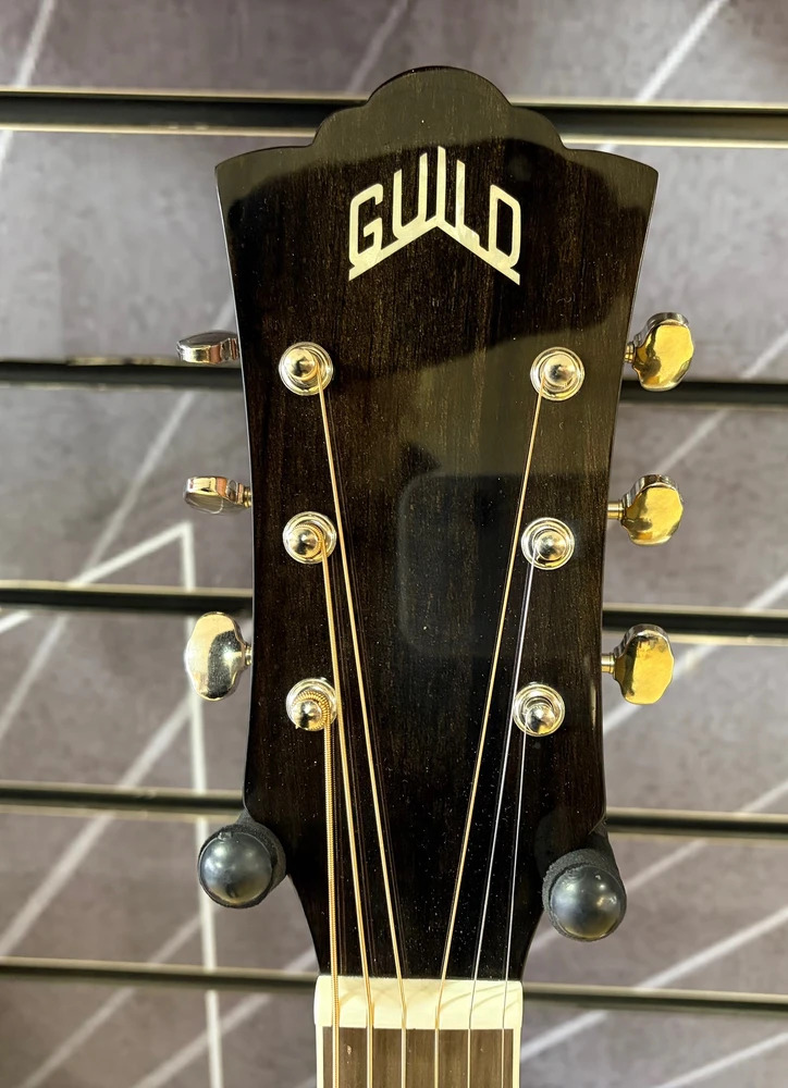 Premium details include a mother-of-pearl rosette, Guild Peak headstock logo, pau ferro fingerboard and bridge, and a Fishman Sonitone pickup system with discreet volume and tone controls, making it stage and studio-ready.