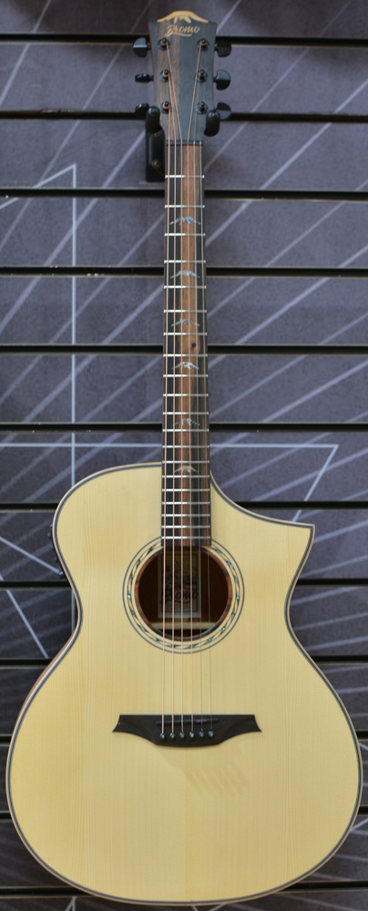 Inspired by the Tahoma volcano in the Pacific Ring of Fire, the Tahoma Series from Bromo is designed for advanced players looking for delicate solid top tones. The Tahoma Series couples a solid Sitka spruce top with premium mahogany back and sides. Sitka spruce is the 1st choice of most players for its articulate, clear tone and prolonged sustain. Complemented by the warmth and mellow tone of the mahogany back and sides and further boosted by the innovative ToneFlow bracing system, Tahoma Series guitars feature crystal clear trebles, sonorous mid tones and a warm bass. The classic Hillside cutaway shape of this Bromo electro acoustic makes it easy to play and the Toneflow bracing boosts its warm tone.