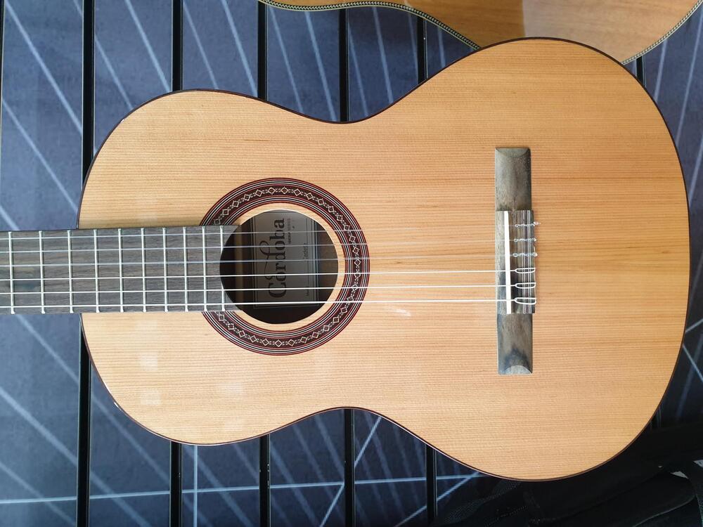 The Cadete is a handmade 3/4 size nylon string guitar built with a solid cedar top and mahogany back and sides. Its traditional 7-fan bracing produces a rich Spanish sound in spite of its reduced string length (615mm scale length). Beautiful hand-crafted elements such as an all-natural wood rosette, Indian rosewood binding, and a lightweight gloss PU finish distinguish the Cadete from other entry-level guitars in its price range. Like all Córdoba guitars, a lightweight adjustable truss rod is built into the neck for stability.