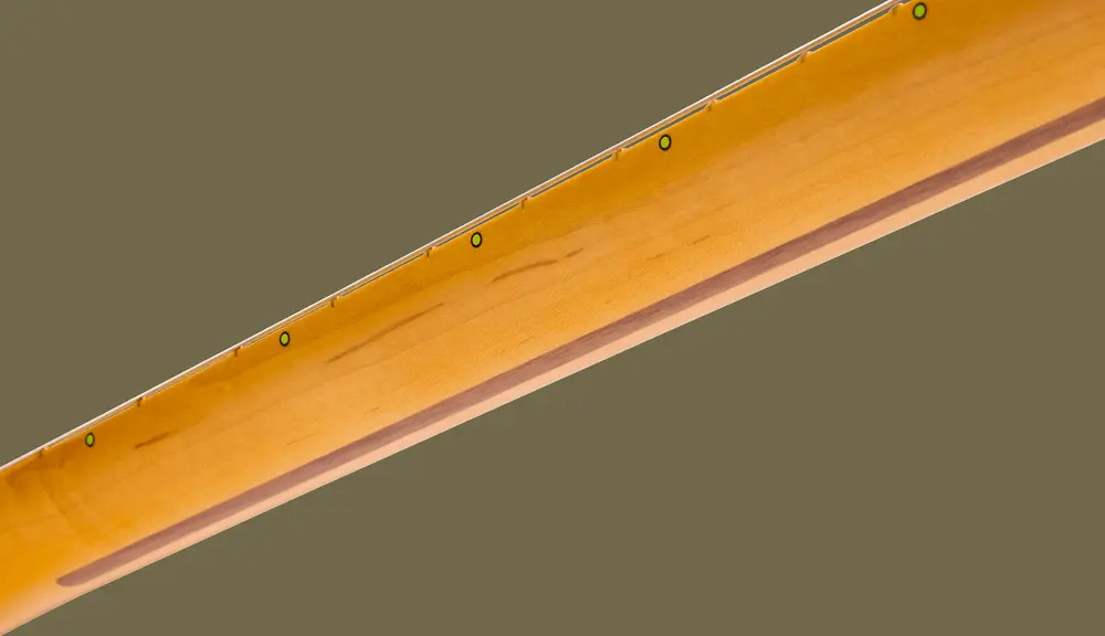Built for speed, comfort and facility, the 10”-14” compound-radius fingerboard is rounded near the nut, becoming increasingly flatter as it nears the upper register. Luminlay® glow-in the-dark side dots provide exceptional visibility even on the darkest stages while “Ultra” rolled fingerboard edges and a silky, smooth “Ultra” satin finish make the neck effortless to play.