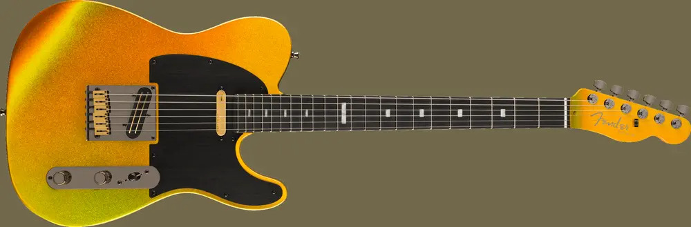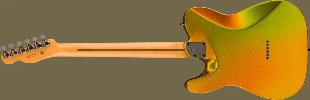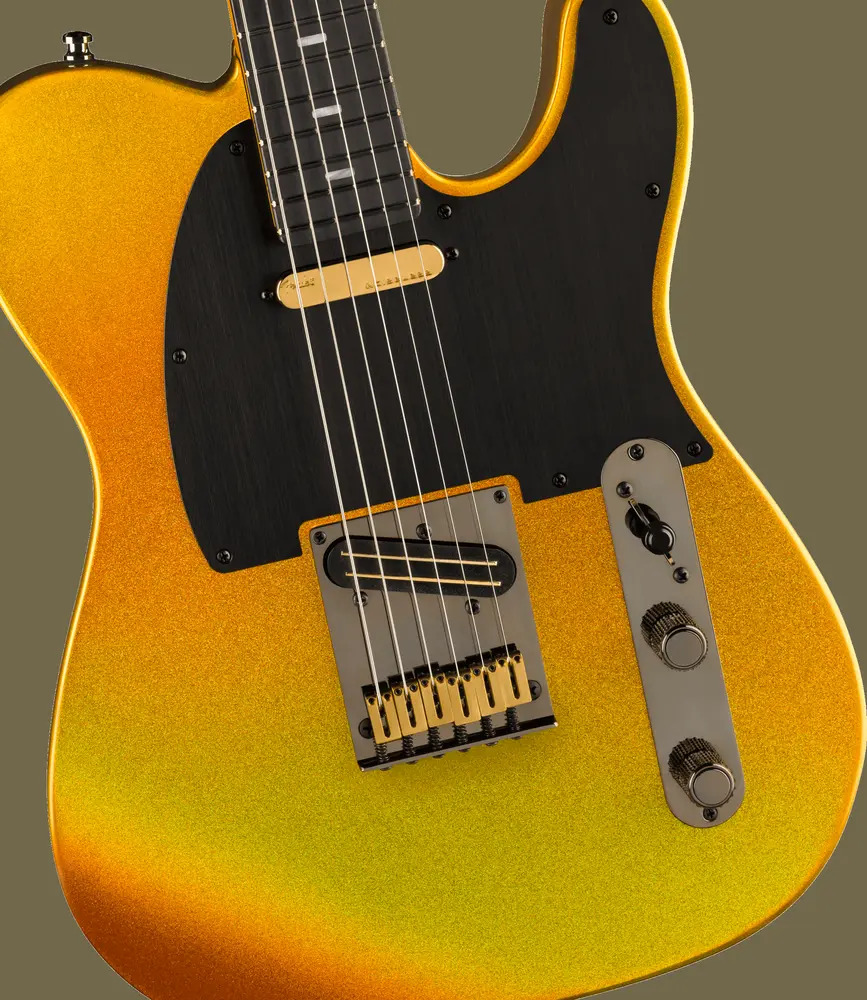 This anniversary Telecaster is dressed up with an incredible Liquid Gold finish that features deep metallic flake which reflects light with a dazzling prism-like glow. All of the hardware is finished in a classy black chrome which is accented by gold appointments on the bridge and pickups for a modern sophisticated look.