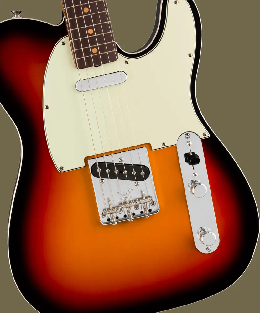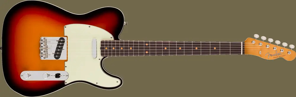 An authentic early ’60s “C”-shaped neck profile provides a comfortably familiar feel, while the 7.25" radius fingerboard with vintage-tall frets offers smooth playability and period-correct performance. Two vintage-style 1963-spec Telecaster pickups deliver the bright, cutting tones and dynamic twang that defined the era and helped cement Fender’s legendary status. A vintage-style three-saddle bridge with threaded steel saddles enhances classic Tele twang and sustain, while vintage-style tuning machines maintain authentic aesthetics with reliable tuning stability.