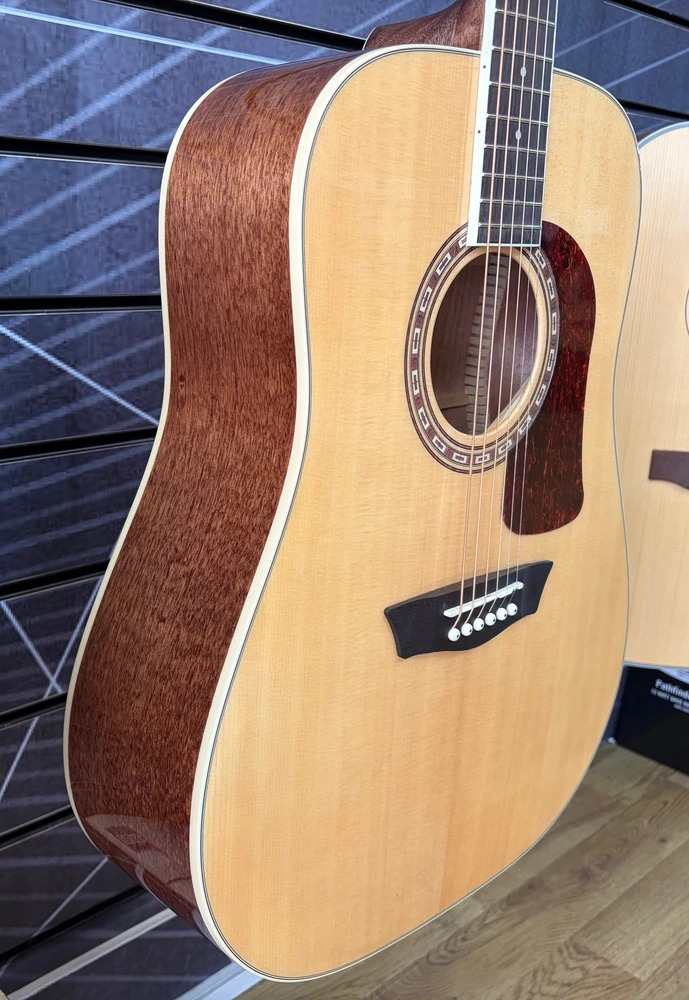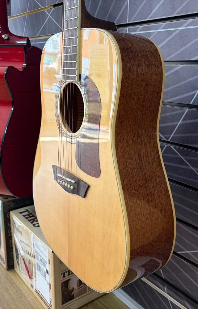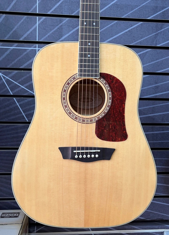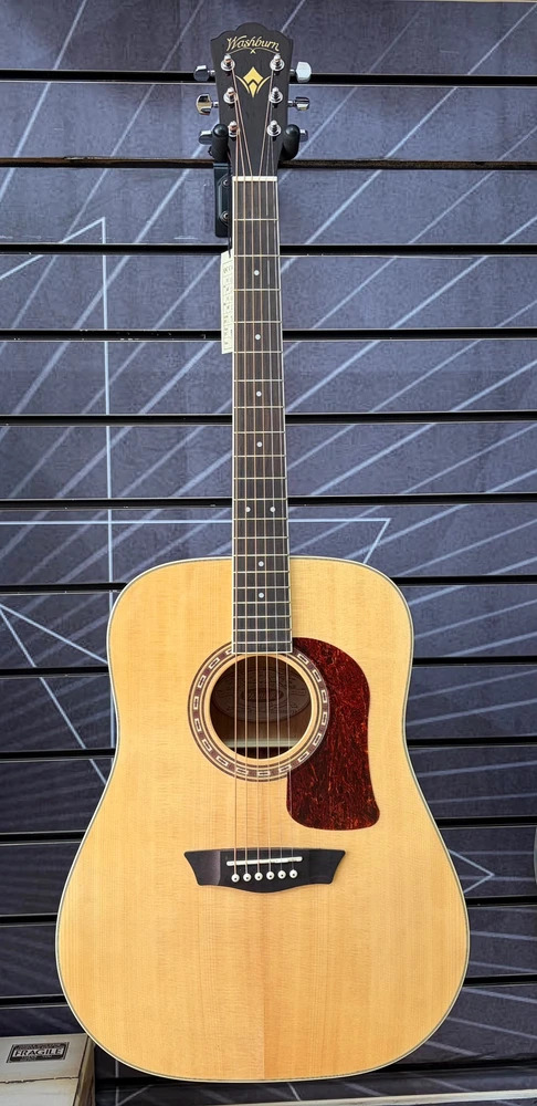 The Washburn D10S features a solid Sitka spruce top with cathedral peak scalloped bracing for superior tone that improves with age, mahogany back, sides and neck, an Ovangkol fingerboard and bridge, die-cast tuners for quick, easy and accurate tuning, a Washburn tortoise pick guard and a custom rosette.