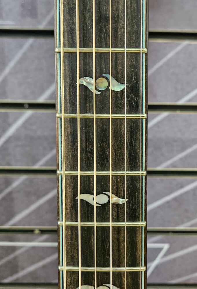 Highlights include turquoise and magenta purfling, snakewood rosette, pearl inlays, nickel hardware and a tortoise pickguard. Strung with D’Addario XS Phosphor Bronze (.012–.053), it’s set up for superb playability straight from the case.