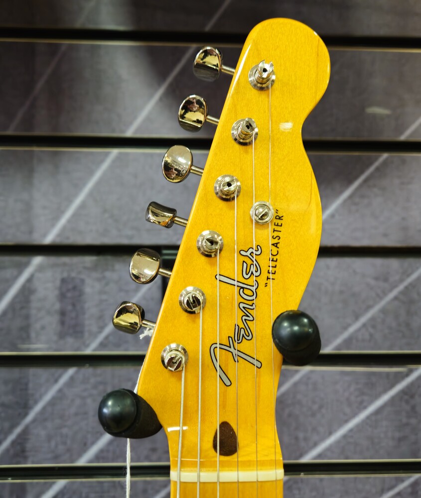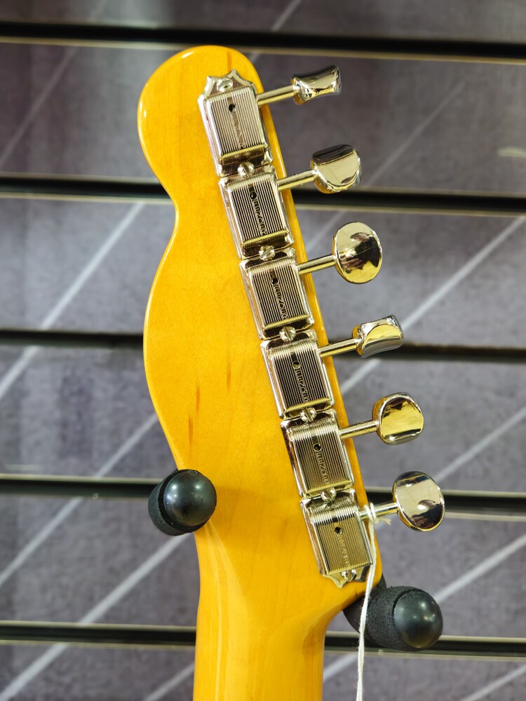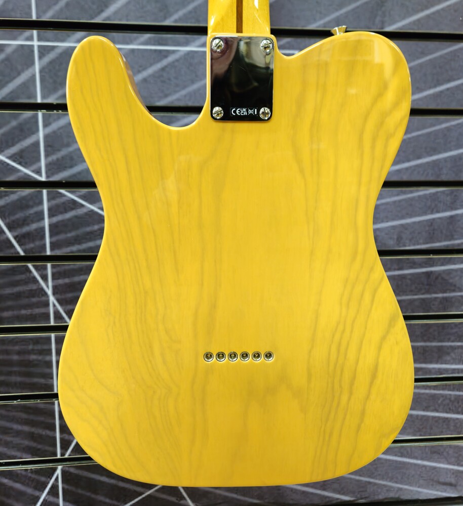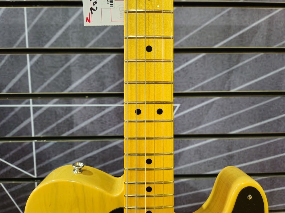 The American Vintage II 1951 Telecaster features an ash body finished in Butterscotch Blonde to capture the tone and look of the original. The substantial 51 U-shaped hard rock maple neck plays like a dream with a 7.25 radius fingerboard and vintage tall frets. Characteristic of production in 1951, 12th fret face-dot spacing is narrow and the sole Phillips-head fastener on the guitar is at the truss rod nut. The triple brass saddle bridge, single-line Fender Deluxe tuners and Pure Vintage '51 Telecaster pickups deliver classic twang and authentic Fender style.